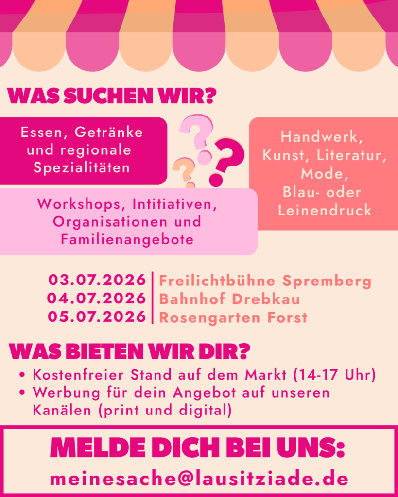 Dann sichere dir deinen Platz für lau in Spremberg (03.07.), Drebkau (04.07.) oder Forst (05.07.) und feiere mit uns die Vielfalt der Lausitz.