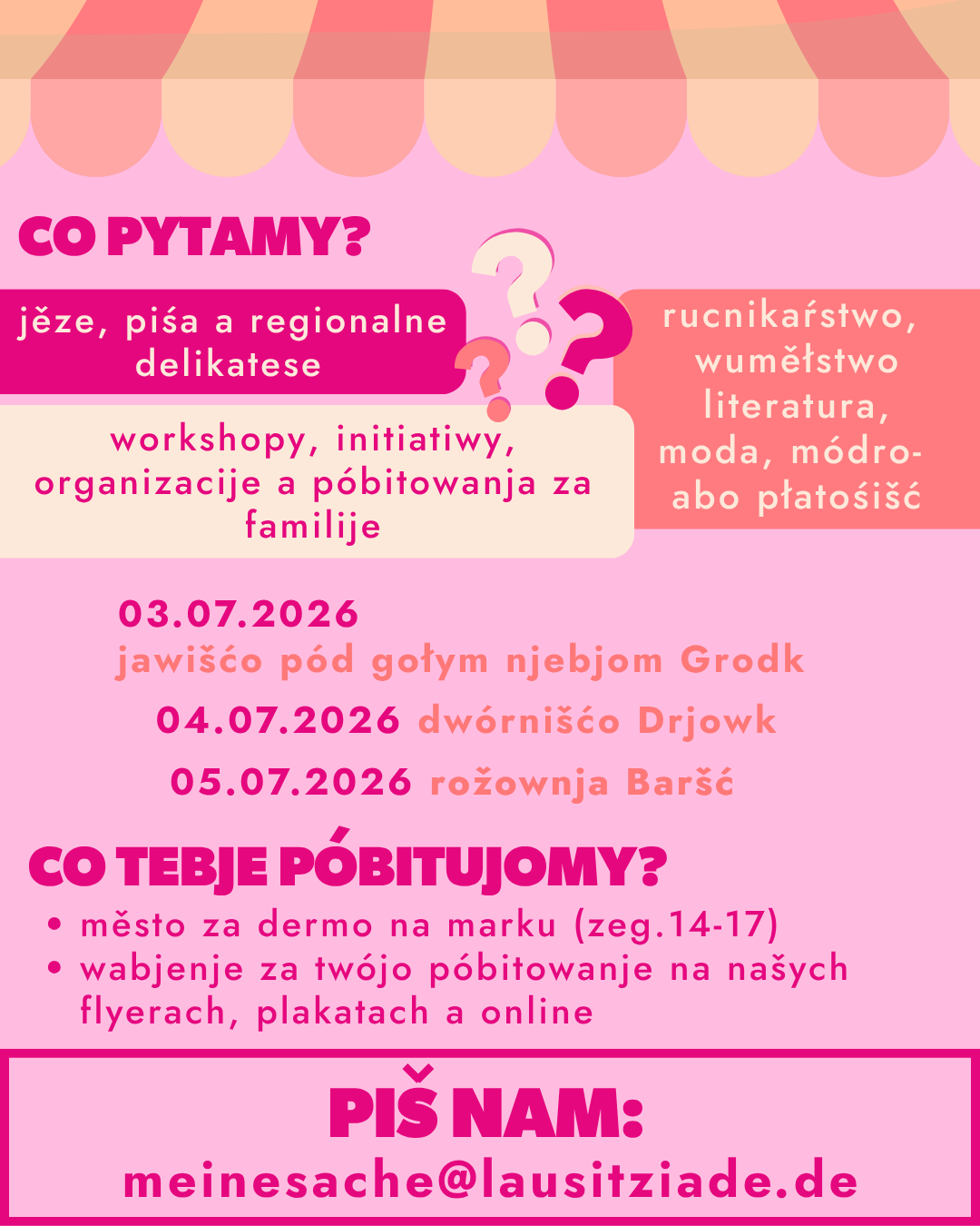 Pón piš nam aby dostał městno za dermo w Grodku (03.07.), Drjowku (04.07.) abo Baršću (05.07.) a swěś z nami wjelerakosć Łužyce.